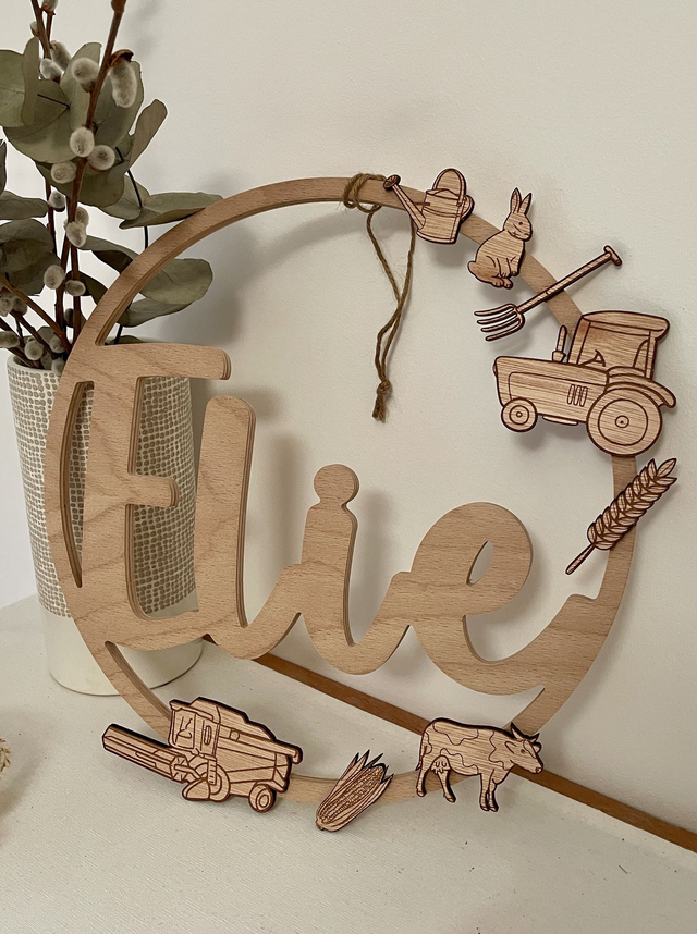 Apportez une touche de tendresse et de fantaisie à l’univers de votre enfant avec cette décoration murale en bois personnalisée sur le thème de la ferme. Ornée d’éléments champêtres en bois, elle invite à la découverte. Le prénom de l’enfant est délicatement intégré au centre pour en faire une création unique, pensée spécialement pour lui.